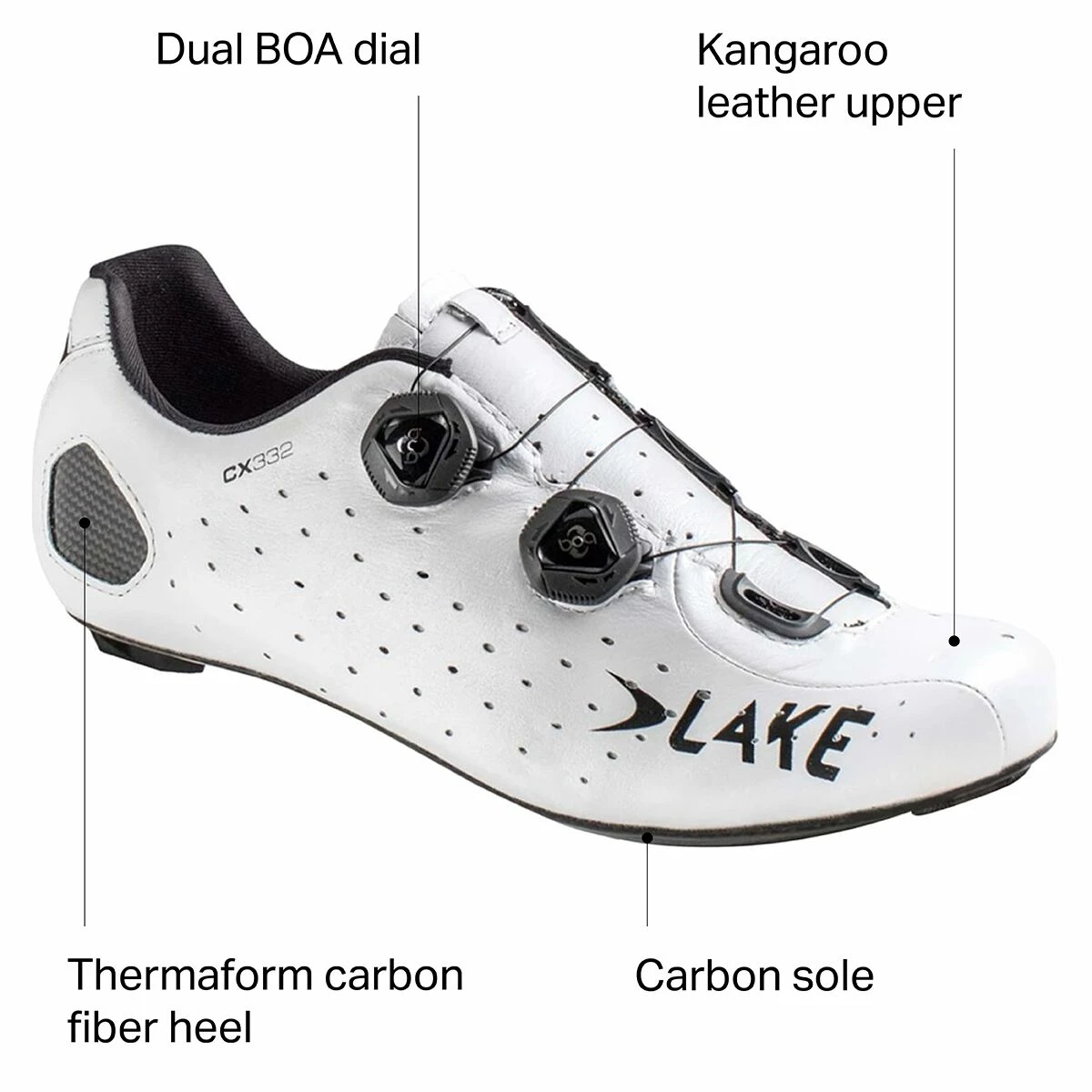 While this version is wider than the standard CX332 and narrower than the Extra Wide version, it still features Lake’s CX/TX Race last which is a little narrower in the toe box and heel than the Competition last found on Lake’s CX237 for a streamlined, glove-like fit that minimizes excess foot movement and prevents hot spots. Combined with a feathery light and stiff 100% carbon fiber sole, and you have a shoe that efficiently transfers every watt of power output into the pedals.