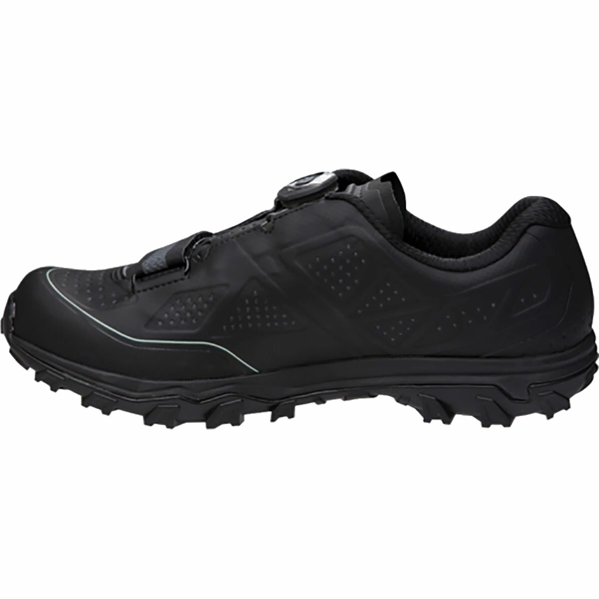 When you’re pushing through long-forgotten sections of trail, laced with fallen trees, you’ll be happy to find a stiff nylon-carbon composite shank that maximizes pedaling efficiency for quick power moves up and over logs and roots, and a lightweight EVA midsole that supports you if things get a little too hairy and you’ve got to hop off the bike and hike through a section. Underneath the EVA, Pearl sets you up with the surefooted grip of a Vibram rubber outsole, featuring Megagrip compound to elevate the traction and durability on rough trails. The aggressive lugs are directional, designed to assist in braking on the heel, and propelling you forward in the toe. The center of the sole is equipped with a recessed SPD cleat mount, allowing you to clip in on the bike, without interfering with your stride when you have to walk.