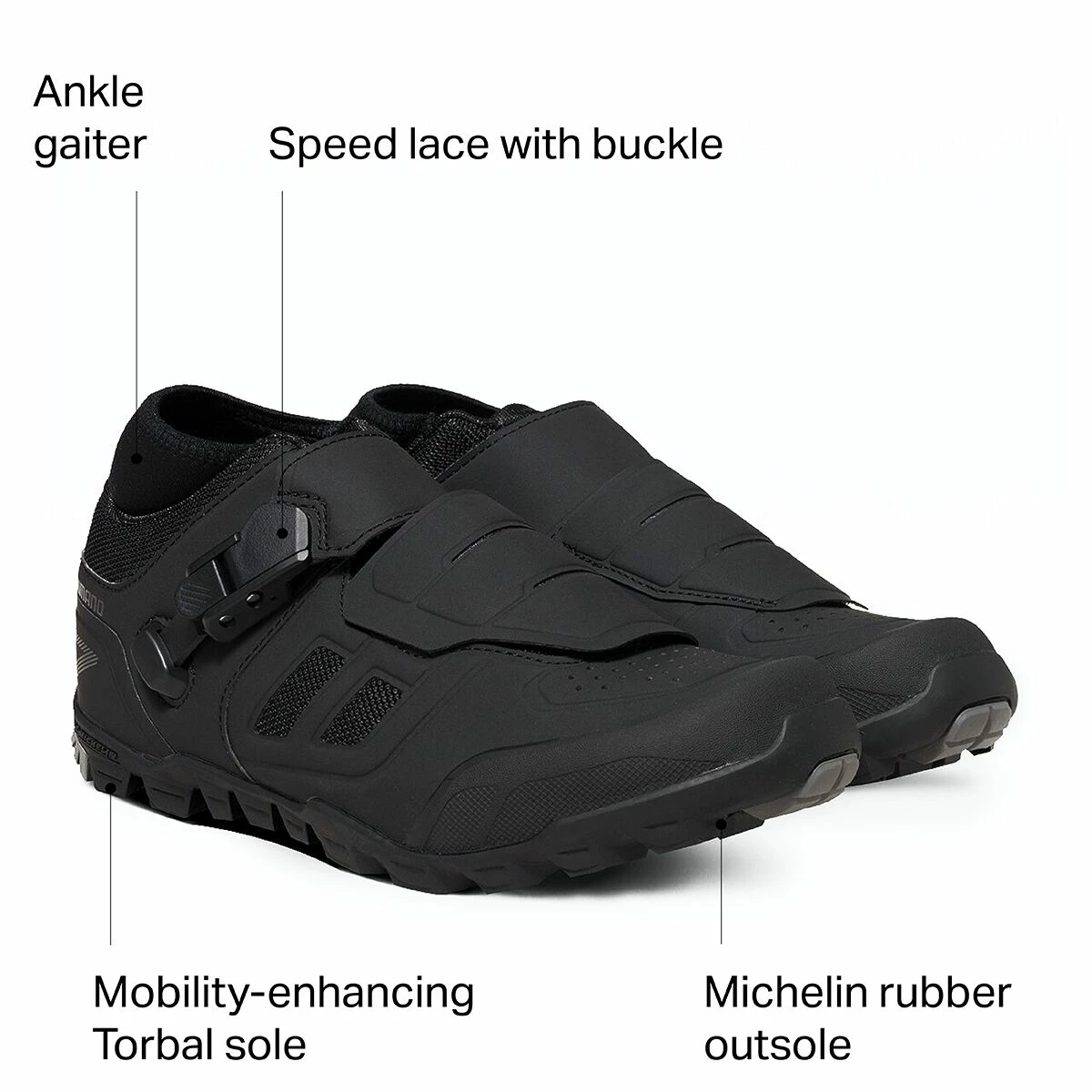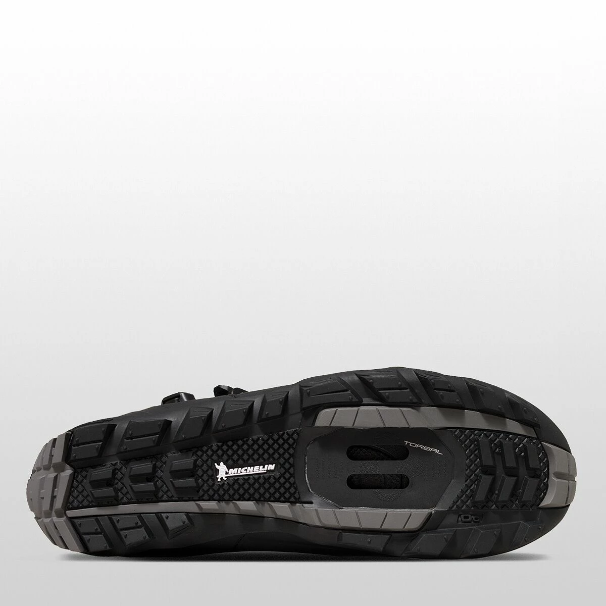 Shimano’s SH-ME7 all-mountain shoe finds a unique balance of blending XC lightness with enduro durability in an value-oriented package. The synthetic upper of the ME7 buckles down for a comfortable, secure fit, without sacrificing much to more performance-focused dials closures. And the speed laces tuck nicely under the top cover. A Michelin rubber sole provides traction for footing in the berms as well as stiffness for the accelerations.