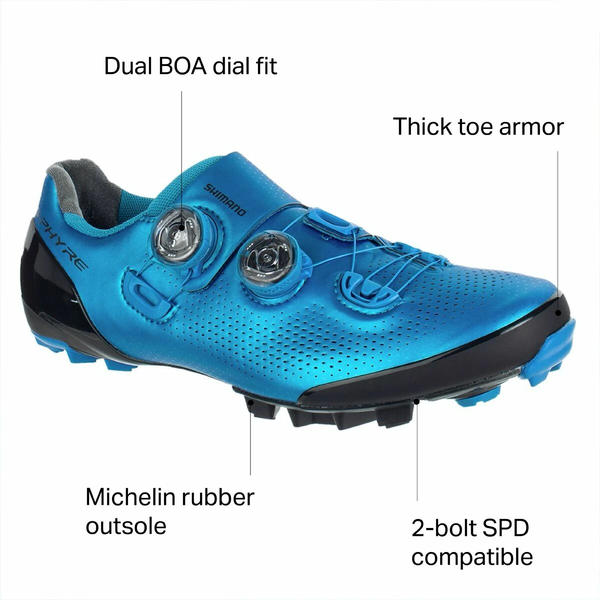 When we glance at the starting line of a World Cup cyclocross or cross-country race, we often notice the flashing silver or bright blue Shimano SH-XC9 on various rider’s feet, eagerly waiting to clip in when the whistle blows and head to the front to string the field out. It’s for good reason too, because if you’ve ever gotten a pair of these shoes in your hands, or better yet, on your feet, you’ll experience that world-class fit, low weight, and efficiency that the pros count on to earn a paycheck. No doubt, these shoes are designed to help you pedal at your best to get you across the finish line faster, however it means nothing if your feet are in agony. Shimano shoes are perennial favorites here in the office and these XC9s receive some light updates since Shimano first launched its S-Phyre lineup—notably a more perforated upper that improves the fit and breathability, and then beefier armor at the toe box.