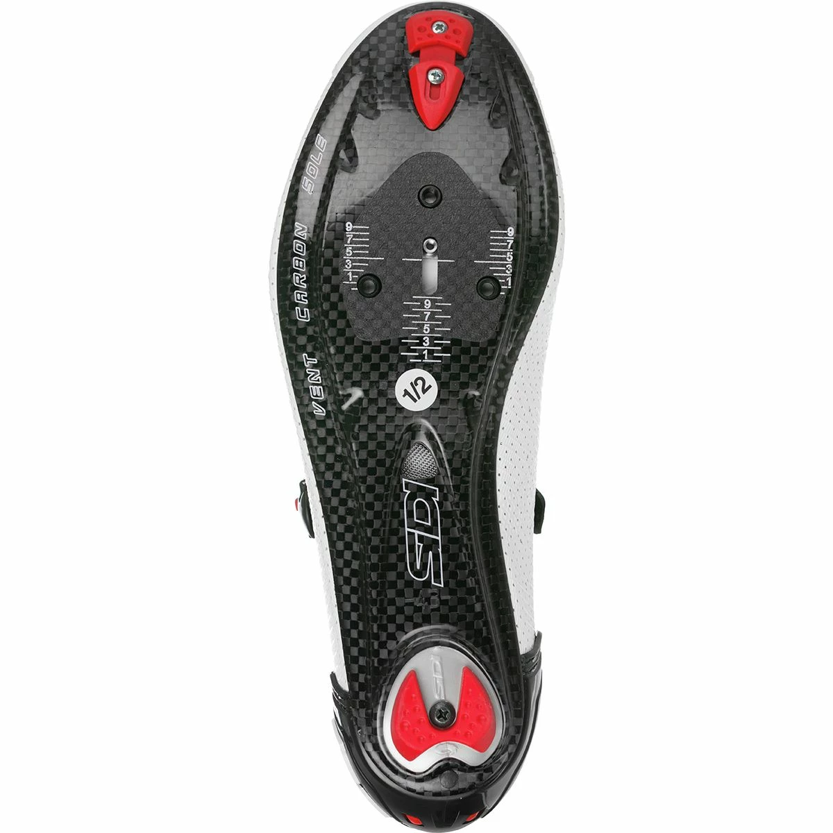 Sole duties are handled by the Vent Carbon Sole, complete with a replaceable, polyurethane heel pad to improve walkability, and a replaceable, integrated toe pad/vent cover. The sole isn’t only impressive because of its efficient power transfer, thanks to its light weight and stiffness, it also aids in all-weather comfort. Using integrated vent and air channels, it allows for exhausting pent-up heat as well as increasing air flow. The vent can be opened in the summer to keep your feet cool and closed during those long base mile winter days. Sidi paid special attention to the layup of the carbon fiber and it features opposing angles that maximize stiffness while allowing for a small degree of controlled flex in the toe area. According to Sidi, this carefully designed flex biomechanically relieves stress on the plantar tendon and helps promote circulation.