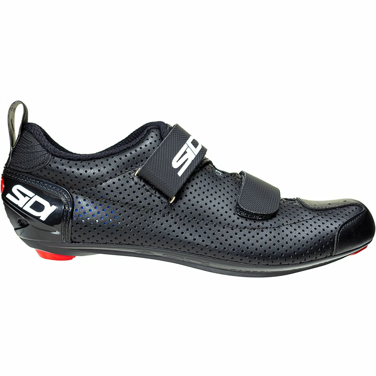 The T-5s reinforced heel cup withstands pressure from use, while the soft lining ensures sock-free comfort. Sidi’s hallmark ratcheting system would be too slow for quick transitions, so the T-5 uses a two-strap closure system and overlapping upper design. The straps have a grippy finish which makes them easy to adjust on the fly, even with hands wet from the swim. An oversized heel pull-tab makes pulling on the shoe as fast as possible while you speed away from the transition zone.