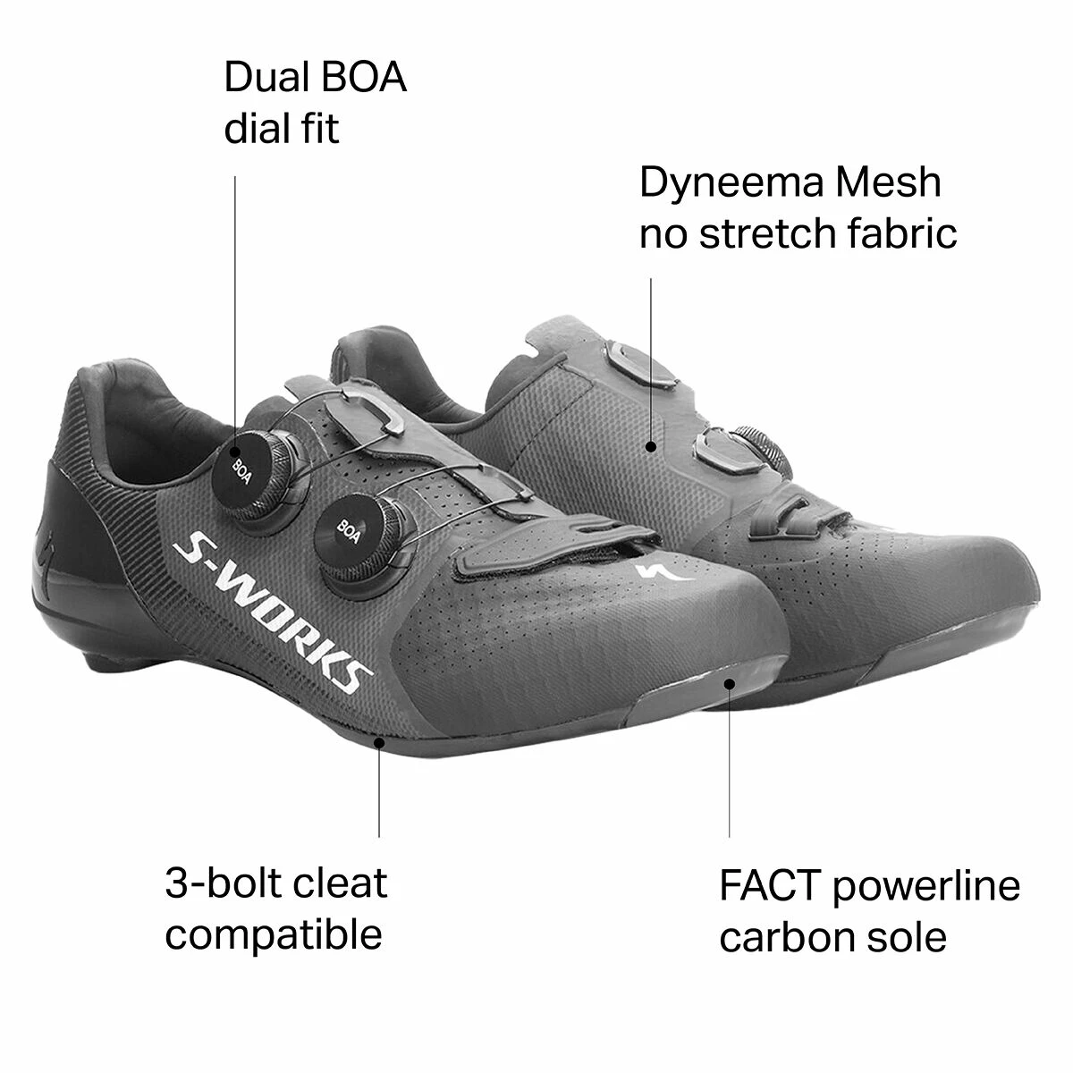 The S-Works 7 series includes the most advanced cycling gear from Specialized, and the S-Works 7 Cycling Shoe strives for perfect road performance without compromising comfort. Made of ply-by-ply carbon originally developed for racing, Powerline is the stiffest, lightest sole from Specialized, and it’s fine-tuned for transferring all the power you push down on those pedals with. The upper is made out of Dyneema Mesh sandwiched between layers of four-way stretch and TPU for flex in key areas and a custom fit.